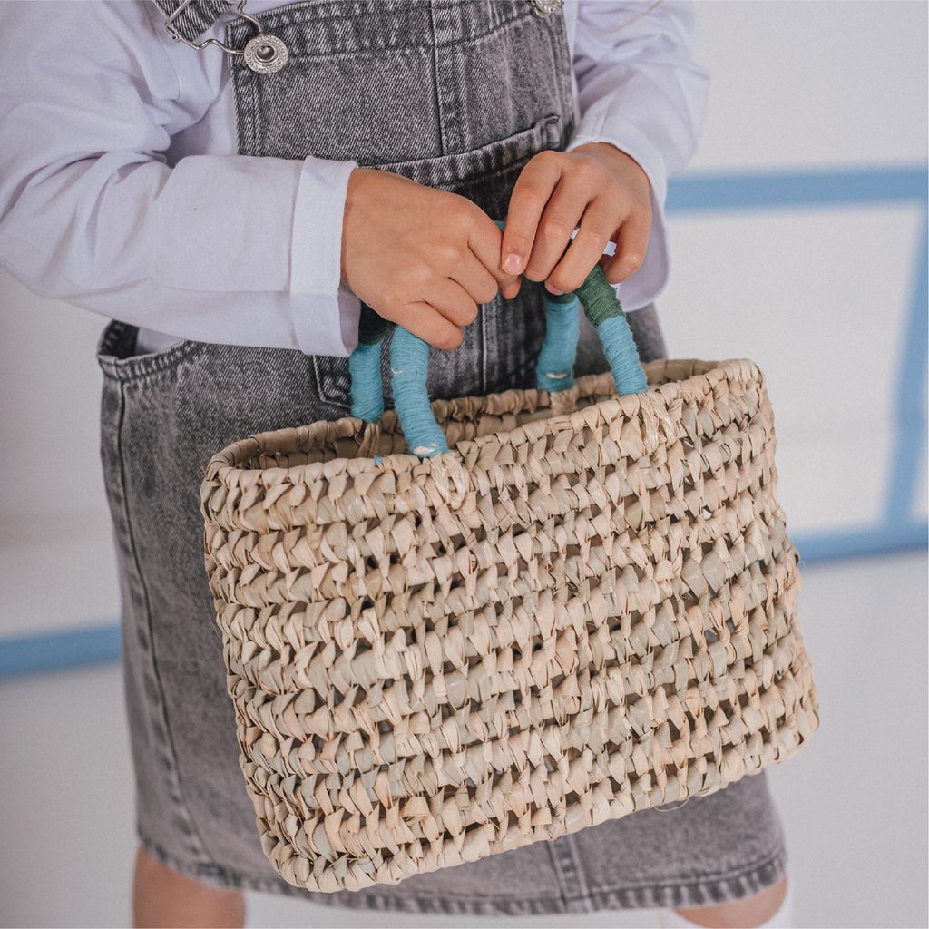 Die Kinder Korbtasche in grün von kikadu ist ein handgefertigtes Produkt aus 100% Palmblättern und eignet sich ideal für Kinder ab 3 Jahren.