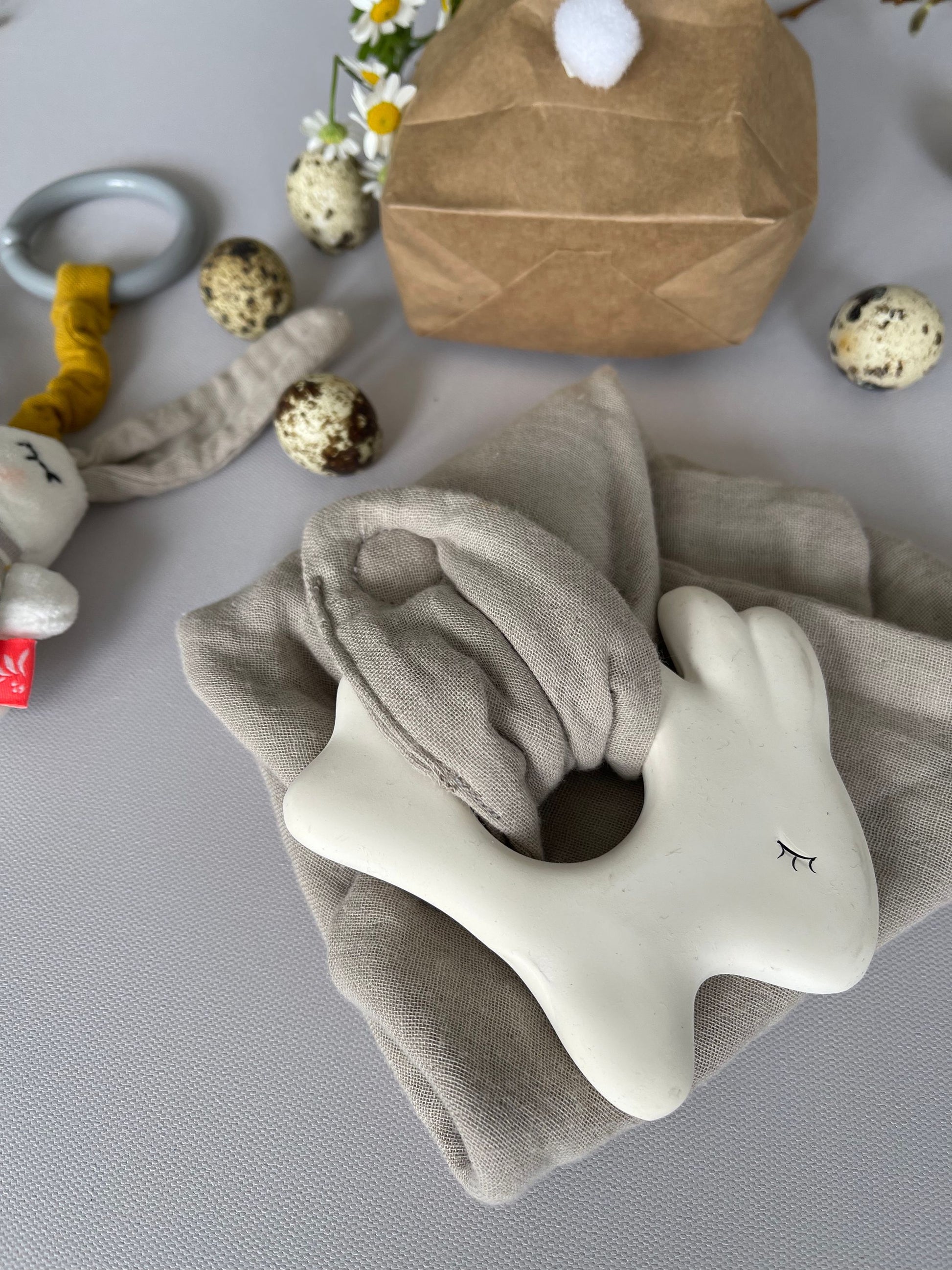 In diesem liebevoll verpackten Osterhäschen-Set befindet sich ein Natur-Kautschuk Hasen Beißring mit Schmusetuch und ein Minimobile mit Pfeifer.