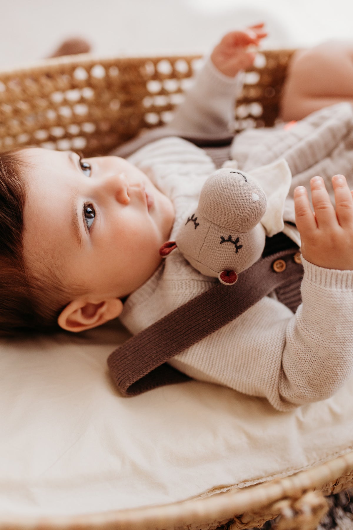 Es besitzt zwei kleine Knoten, die dazu einladen, von Babys gegriffen und erkundet zu werden.