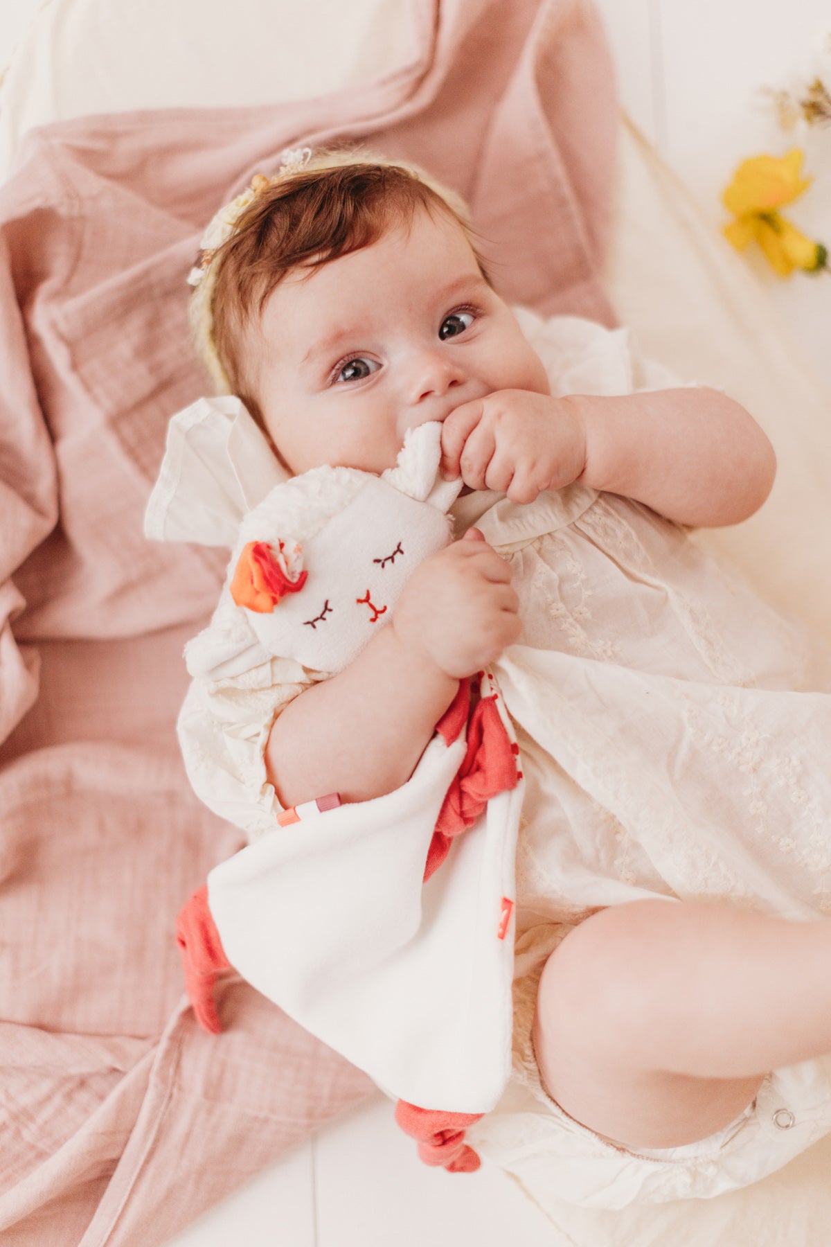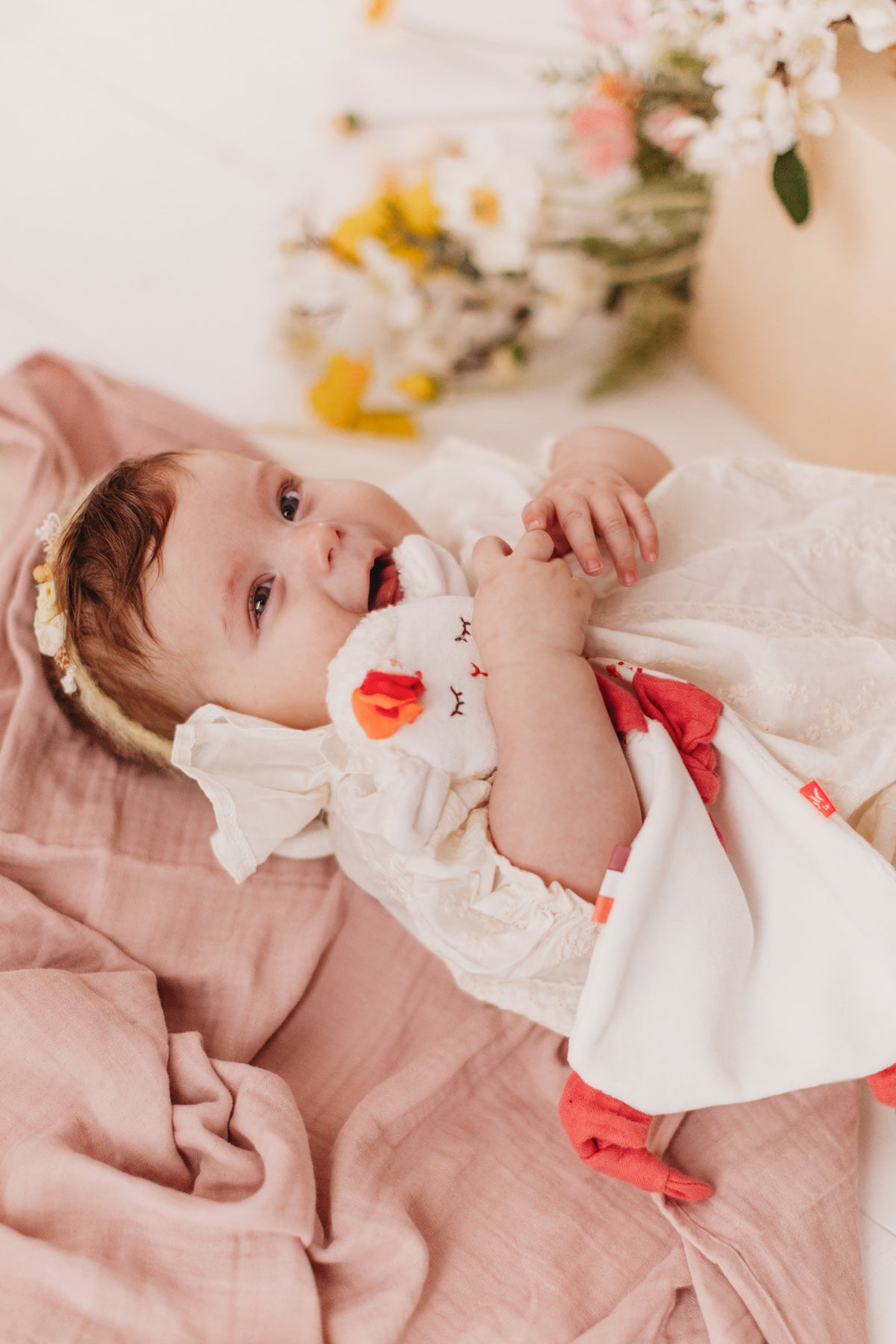 Dieses Schmusetuch Lämmchen von Kikadu ist mit seinen verspielten Details ein toller Freund für dein Kind. Die Knötchen an Händen und Füssen werden gerne zum „Schnüffeln“ genommen. Das weiche Tuch vermittelt das Gefühl von Sicherheit, Geborgenheit und Vertrautheit und begleitet dein Kind sicher beim Einschlafen.